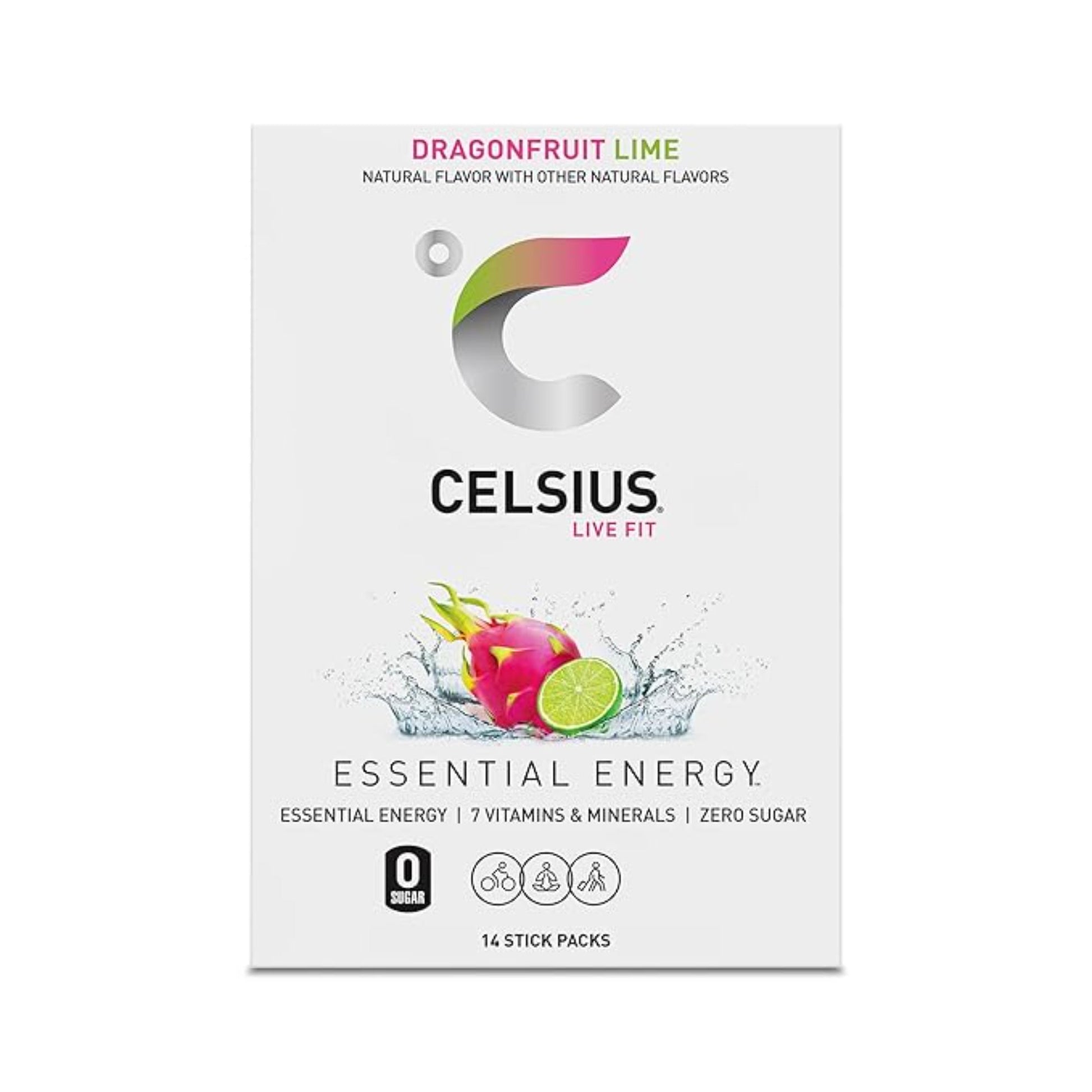 CELSIUS® is functional, Essential Energy– a better-for-you, premium alternative to traditional energy drinks, made with 7 essential vitamins and zero sugar. As a global, lifestyle fitness drink, CELSIUS was created to help people LIVE FIT, exceed their goals and elevate their everyday lives. Our CELSIUS On-the-Go Powder Sticks contain the same clinically proven ingredients as CELSIUS, only its compact, convenient and perfect for traveling. Whether you’re hiking trails, beachside chillin’ or ski lodge loungin’, CELSIUS On-the-Go Powder Sticks are ready when you are, so you can be ready for anything. Our proprietary MetaPlus® blend contains green tea extract and EGCG. It also includes guarana seed extract, ginger root for flavor and digestion, vitamin C to support your immune system, vitamin B for energy production, and chromium to help control hunger, making it an ideal pre-workout drink. CELSIUS On-the-Go Powder Sticks allow you to adjust the powder you use depending on the level of energy boost you require, making it a flexible option. Our powders can be mixed with various liquids, such as water, juice, smoothies and protein shakes, allowing you to personalize the taste and consistency to your liking. Packed with sweet and delicate flavors of exotic dragonfruit and tart hints of lime, the unique flavor of CELSIUS® Dragonfruit Lime On-the-Go Powder Sticks will take your tastebuds on a tropical journey. Enjoy CELSIUS® On-the-Go Powder Sticks anytime, anywhere. Just add water and go! Add one powder stick packet to 12-16 oz. of water and you have Essential Energy on the go. CELSIUS® On-the-Go Powder Sticks have the perfect balance of flavor and energy that serve as an awesome pick-me-up for active lifestyles. One powder stick is equal to one CELSIUS ready-to-drink can, and each box comes with 14 powder stick packets. Make CELSIUS® Essential Energy your go to pick-me-up– anytime, any place!